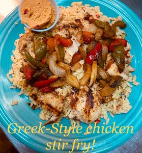 This dish won't leave you disappointed. Grilled vegetables over rice with a choice of grilled chicken or gyro meat comes with a choice of hummus. Served with a warm pita and a side salad for $ 15.99